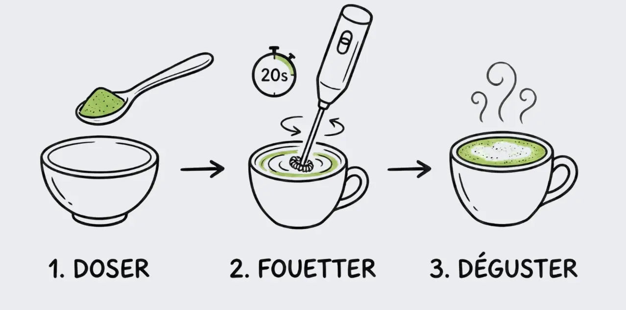 Le matcha, c’est 100% des feuilles, broyées en poudre. Tu les bois entièrement, donc tu consommes beaucoup plus d’antioxydants, de caféine naturelle et de L-théanine. Le thé vert, tu infuses juste l’eau.