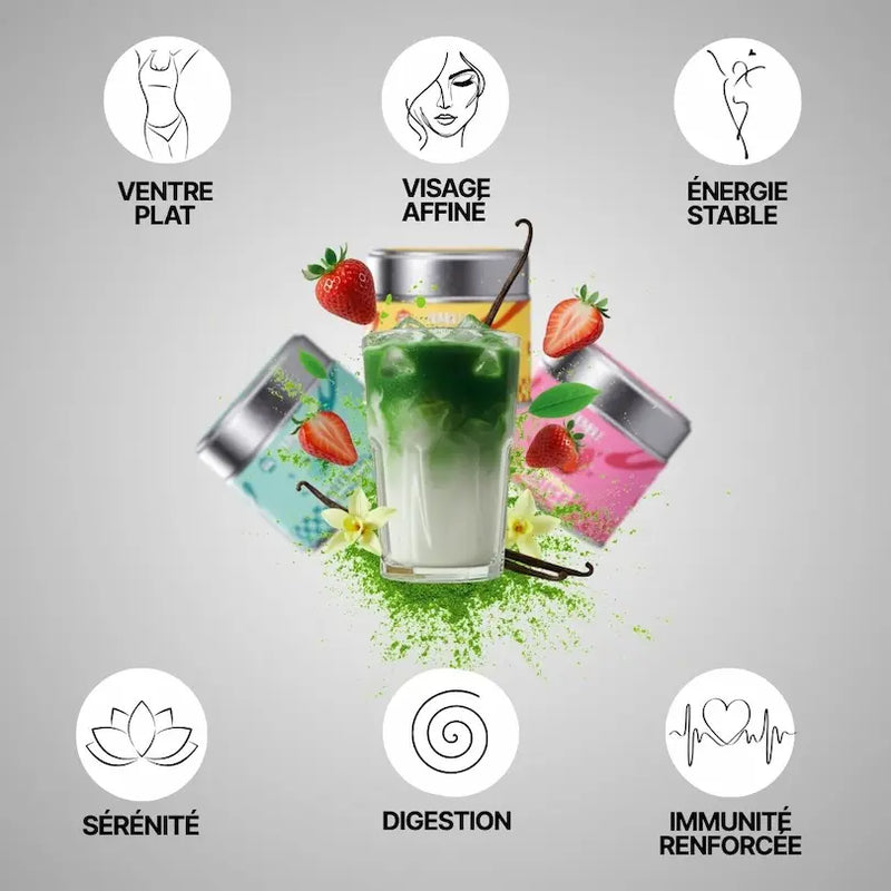Le matcha est riche en catéchines, qui aident à booster le métabolisme, réduire les fringales, réguler le cortisol (hormone du stress) et favoriser la perte de graisse viscérale. Beaucoup de clients observent un ventre moins gonflé, un visage plus affiné et un regain d’énergie après 2 à 3 semaines.